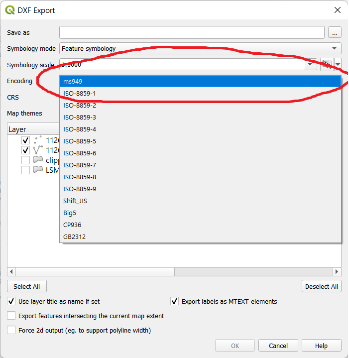 - 이렇게 변경된 qgis_core.dll을 저장하고 원래 있던 apps\qgis\bin 폴더에 덮어쓰면 됩니다. 이후 QGIS를 실행하면 아래와 같이 [프로젝트를 DXF로 내보내기]에 ms949라는 인코딩이 뜨며 이걸 이용해 DXF를 내보내면 한글이 안 깨지고 잘 나가게 됩니다.