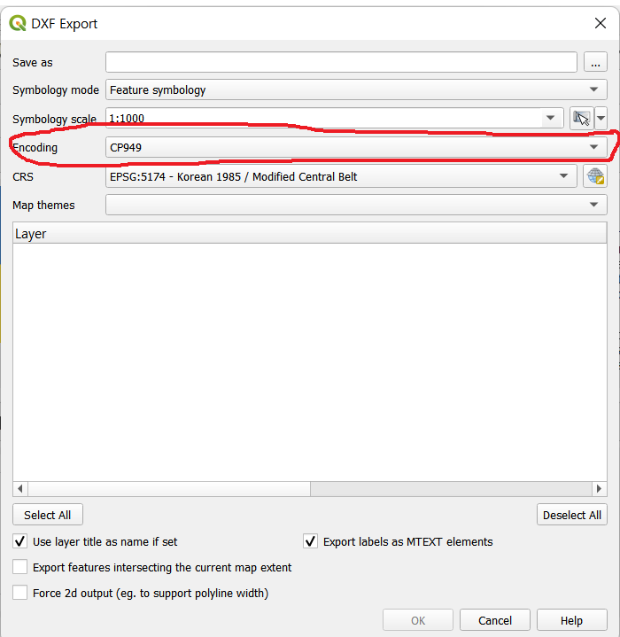 QGIS [프로젝트 DXF 내보내기]에서 CP949 사라짐 문제 해결 방법